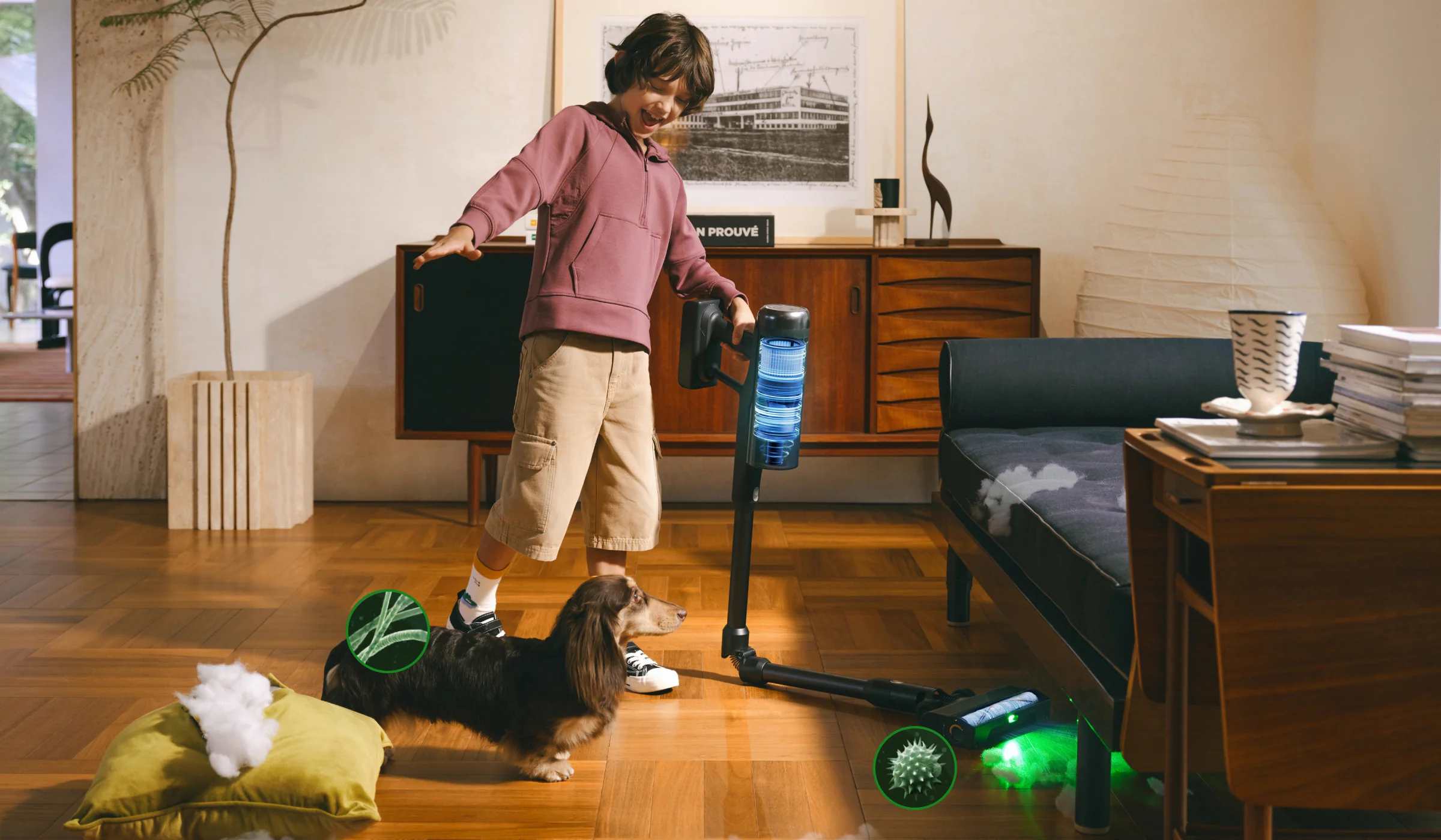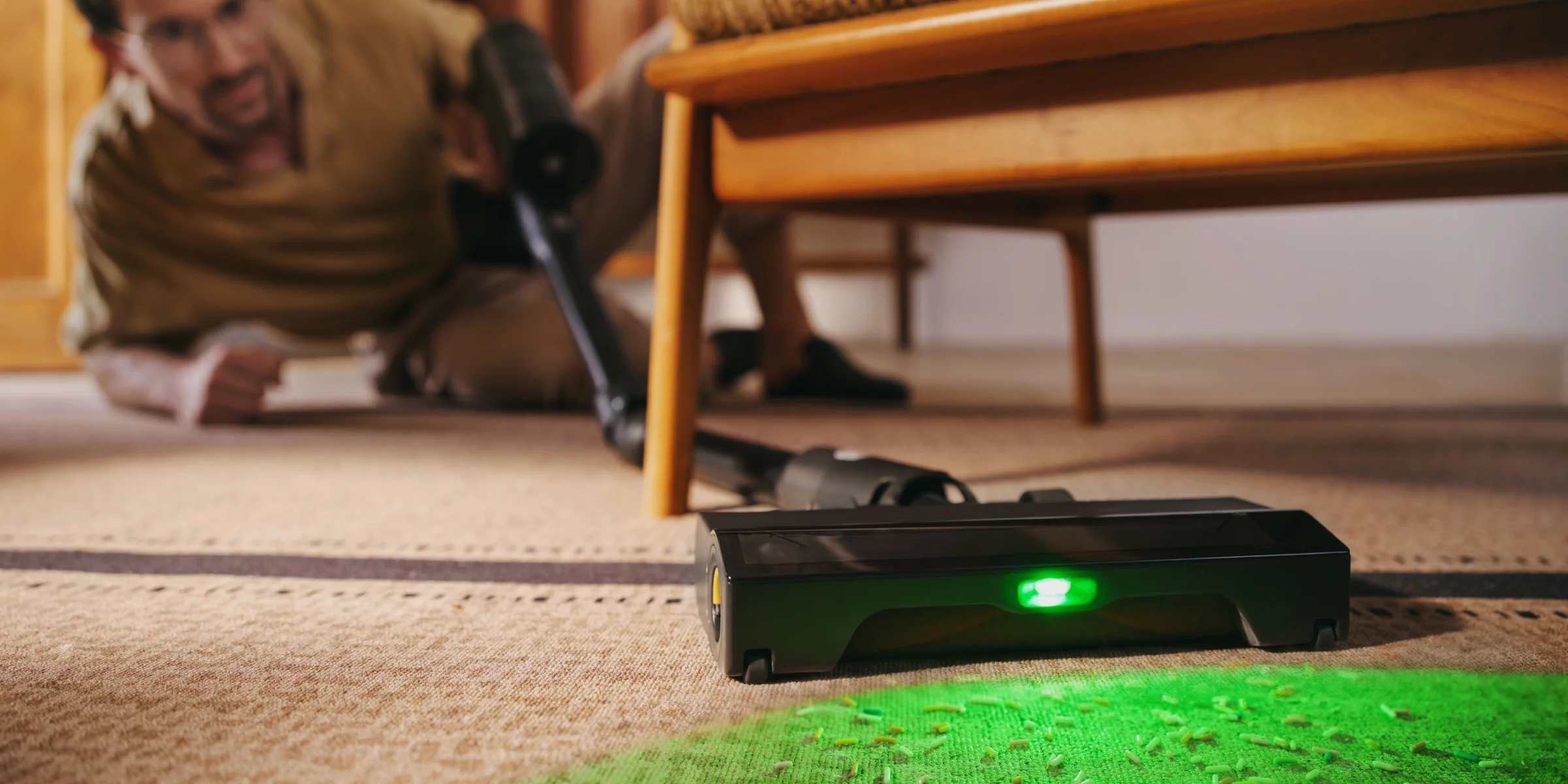 תאורת האור הירוקה חושפת אבק נסתר לניקוי יסודי יותר, בעוד שמערכת הסינון המתקדמת מסייעת לשמור על אוויר רענן בביתכם על ידי הפחתת זיהום משני.